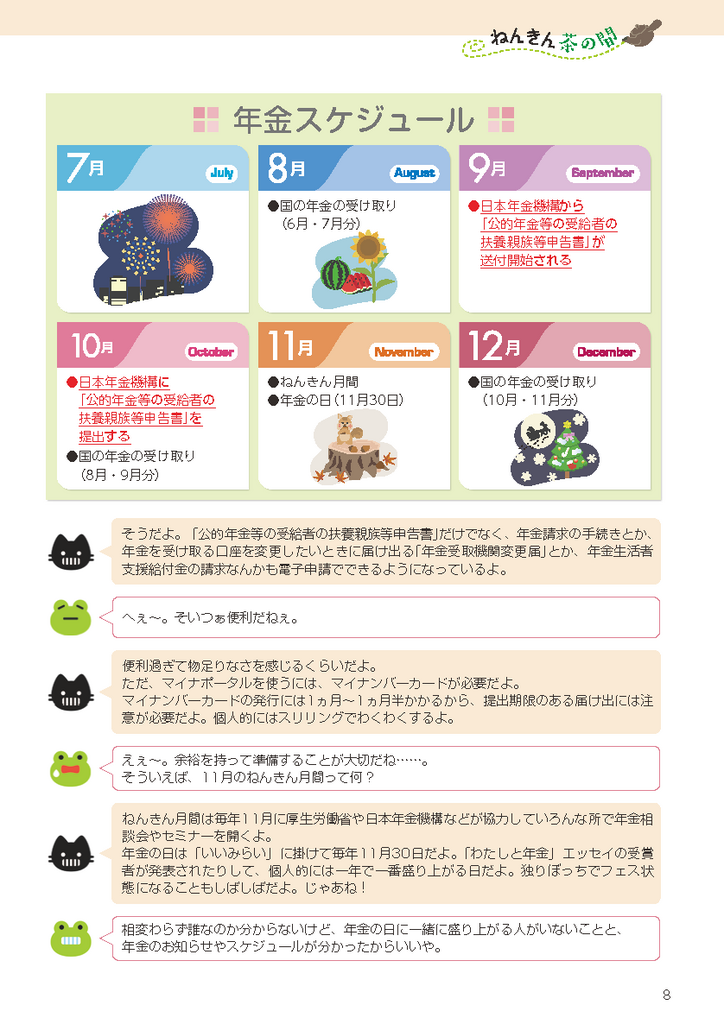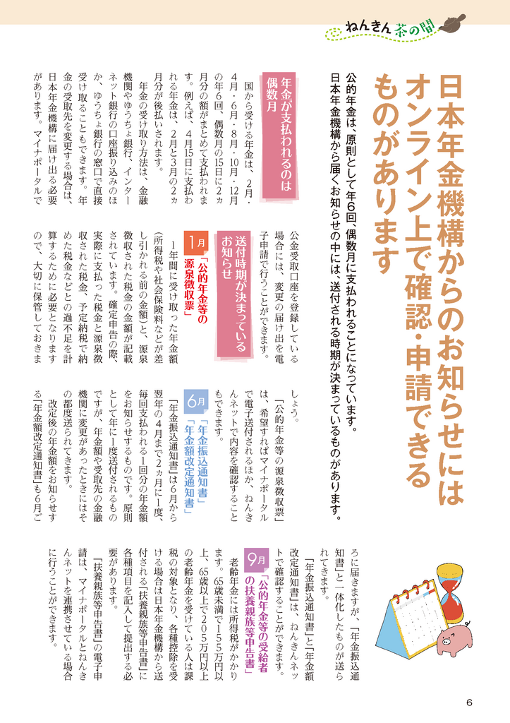 2026年春号のイチオシ記事は、日本年金機構から年金受給者に送られてくるお知らせと「年金カレンダー」です! 「公的年金等の源泉徴収票」や「年金振込通知書」など送られてくる時期が決まっているお知らせや、オンラインで確認・申請できるものを紹介しているほか、公的年金の受取日などがひと目でわかる「年金カレンダー」も掲載しています。