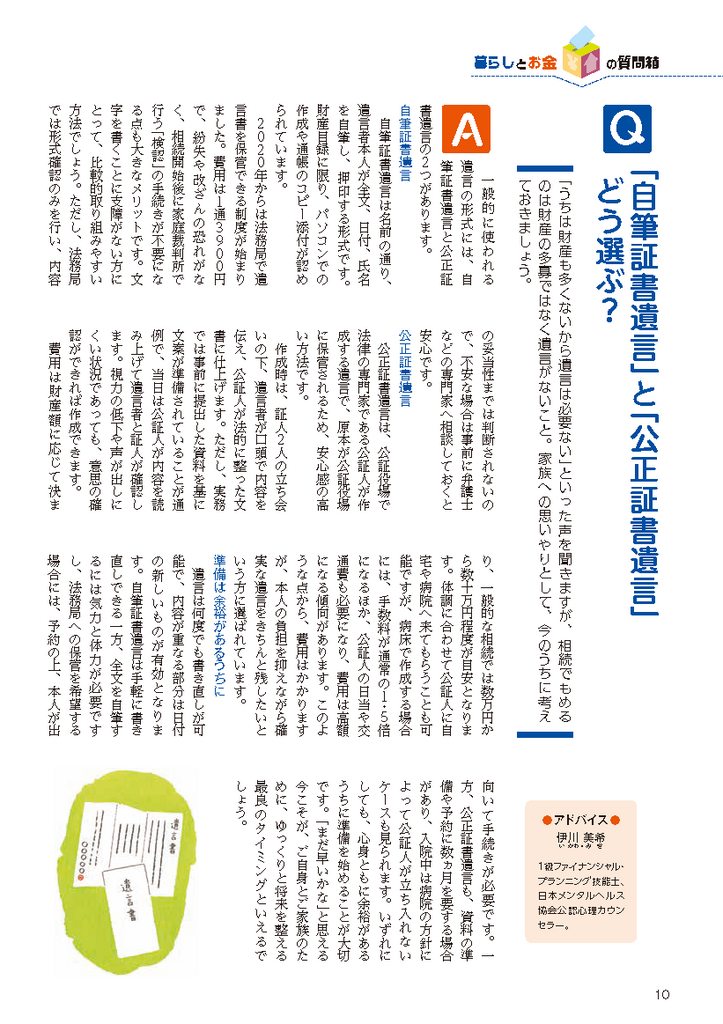 このほか、要介護の認定を受けてもケアマネジャー不足でサービスを受けられないという相談や、「自筆証書遺言」と「公正証書遺言」について解説しているページもあります。春号でおすすめする趣味は大人ひとり旅です!